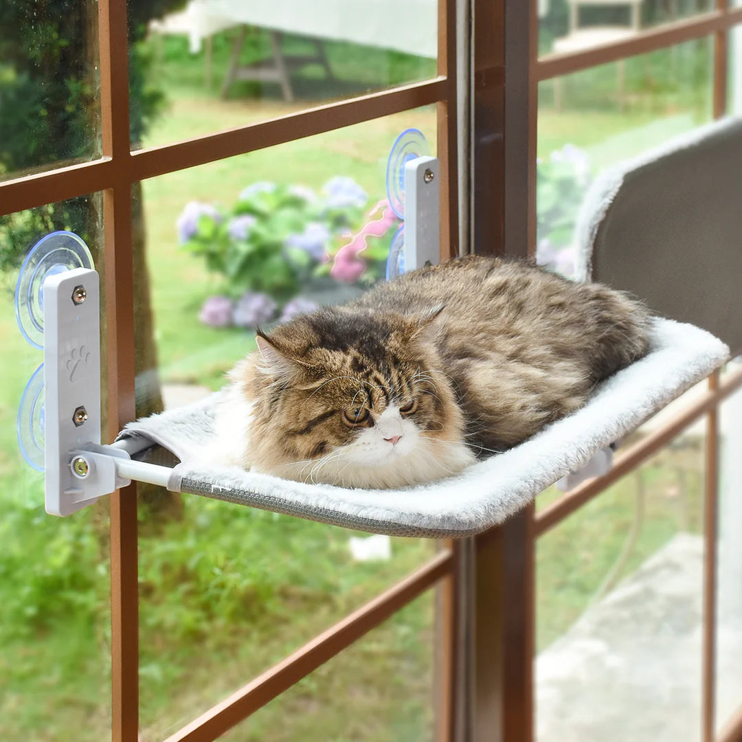 This cat window shelf has a unique design that allows you to flip it up and close the blinds or curtains for privacy without needing to detach and reattach it to the window.
